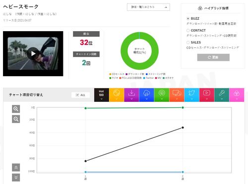 最新4月14日公開(4月19日付)ビルボードジャパンソングスチャートで前週より52ランクアップし32位につけたのが、にしな「ヘビースモーク」です。