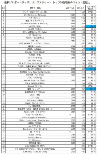 毎週木曜は、最新のビルボードジャパンソングスチャートから注目点を紹介します。 7月26日~8月1日を集計期間とする8月4日公開(8月9日付)ビルボードジャパンソングスチャート(Hot 100)。フィジカル関連指標初加算に伴い、ジャニーズWEST「でっかい愛」が首位…