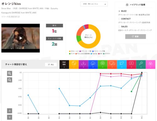 毎週木曜以降は、最新のビルボードジャパン各種チャートについてお伝えします。 最新7月20日公開分(7月25日付)ビルボードジャパンソングスチャートはフィジカル関連指標初加算に伴いSnow Man「オレンジkiss」が首位に到達しました。 【ビルボード】Snow Man…