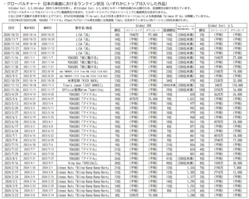 米ビルボードが2020年に新設したグローバルチャート、最新3月23日付においてCreepy Nuts「Bling-Bang-Bang-Born」がGlobal 200で13→8位、Global 200から米の分を除くGlobal Excl. U.S.では6→3位に上昇しています。 This week's #Global200 top 10 (chart dat…