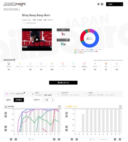 最新3月27日公開分(集計期間:3月18~24日)のビルボードジャパンソングチャートでは、Creepy Nuts「Bling-Bang-Bang-Born」が9連覇を達成しています。 【ビルボード】Creepy Nuts「Bling-Bang-Bang-Born」総合連続首位記録9週で歴代2位へ、Travis Japan/ZERO…