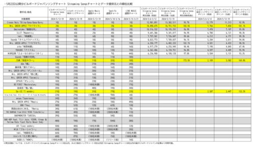 今回は最新5月22日公開分ビルボードジャパンソングチャートにて特筆すべき動きを示した曲を紹介します。下記表にて黄色で示した3曲が、今回採り上げる作品です。