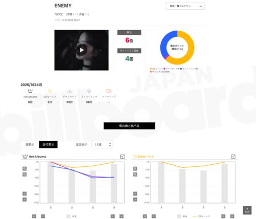 藤井風『Prema』が3連覇を達成した最新9月24日公開分(集計期間:9月15~21日)のビルボードジャパンアルバムチャートでは、TWICEの2作品が同時にトップ10入りを果たしています。 【ビルボード】藤井 風『Prema』が3週連続で総合アルバム首位 ATEEZ『Ashes to …