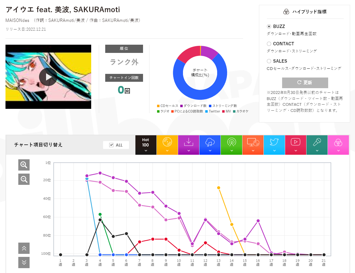 「アイウエ」も「トウキョウ・シャンディ・ランデヴ」もダウンロード指標(CHART insightでは紫で表示)が当初牽引していますが、後者ではダウンロードが下がってきたタイミングで動画再生(赤)が伸び始め、その後ストリーミング(青)、カラオケ(緑)が反応。それに合わせてダウンロードも再浮上している状況です。