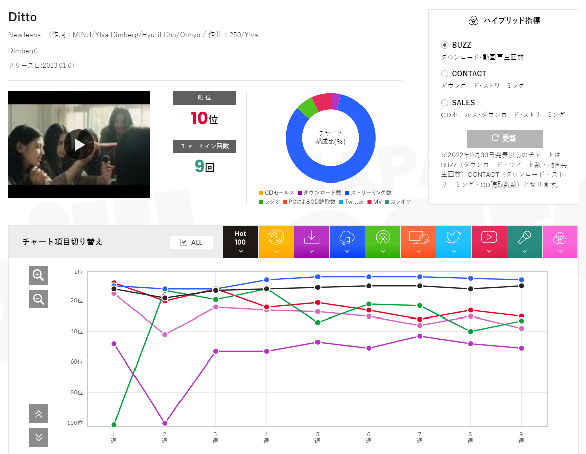 しかしながら「OMG」はストリーミング指標が上昇しており、2月22日公開分ビルボードジャパンソングチャートでは同指標で初めてトップ10入り。次週3月1日公開分における同指標の速報値では9位に入っています(速報値については百足 & 韻マン「君のまま」紹介時に貼付したツイート内リンク先を参照)。NewJeansは「Ditto」と「OMG」がビルボードジャパンソングチャートにて同時トップ10入りする可能性があるでしょう。