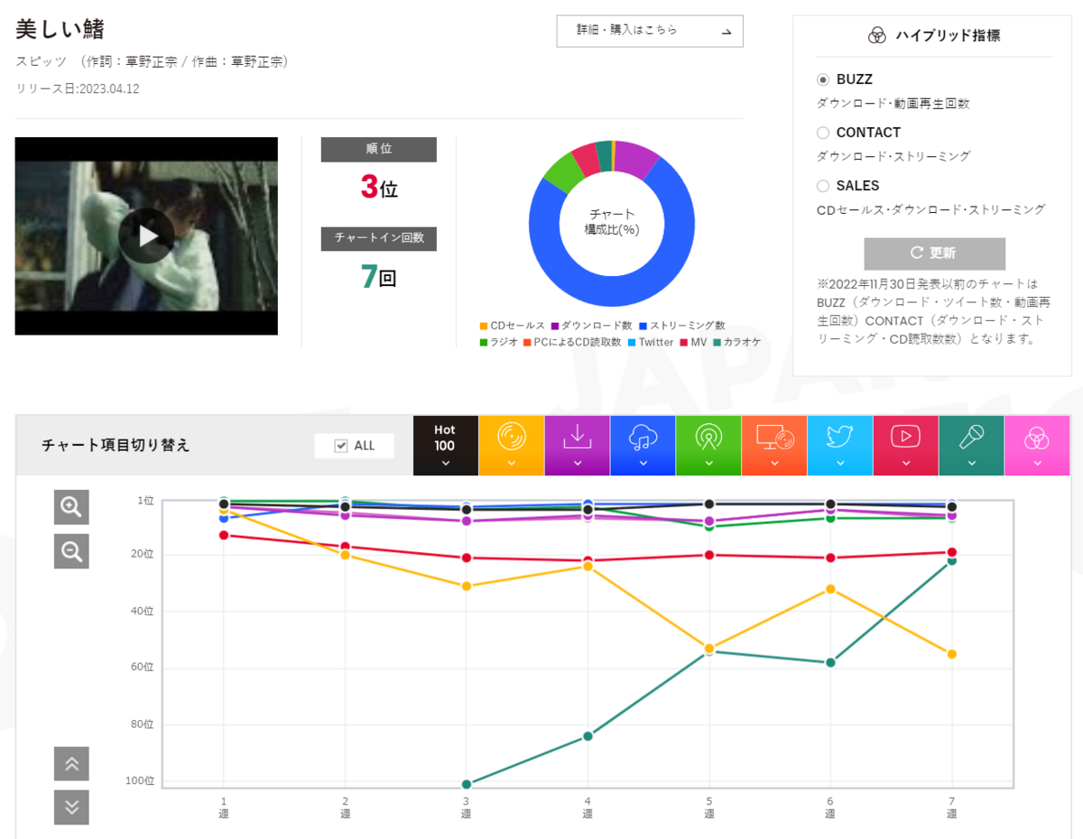ビルボードジャパンのソングチャートおよびトップアーティストチャートの記事には100位までがすべて掲載。ソングチャート関連ではストリーミングが20位まで掲載され、うち18曲が集計期間中に1億回再生を突破しています。またその他のチャートについても20位まで、一部については数値付きにて掲載されています。