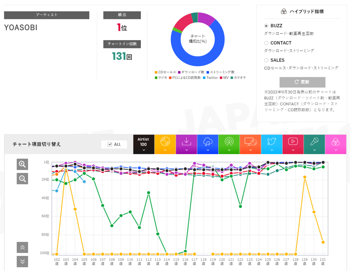 CHART insightにおける色の内訳は総合が黒、ソング/アルバムチャート共通指標ではフィジカルリリースが黄色、ダウンロードが紫で、ソングチャートのみの指標ではストリーミングが青、ラジオが黄緑、動画再生が赤、カラオケが緑で、それぞれ表示されます。なおオレンジで示されるルックアップ、水色のTwitterは2023年度以降廃止されています。