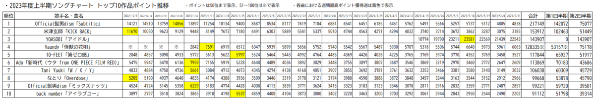 ビルボードジャパンソングチャートは週間50位までのポイントが可視化されています。この可視化されたポイントのみで集成した表を下記に掲載しますが、表におけるポイントは暫定のものです。