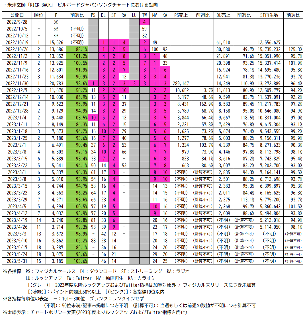 再生回数を踏まえれば、加点対象となるISRC(国際標準レコーディングコード)の未付番が続いていると考えていいでしょう。仮にこの点がしっかり行われていたならば、上半期ソングチャートの順位は間違いなく上昇したはずです(「君のまま」は32位にランクイン)。これら失点をなくすことが、歌手側には求められます。