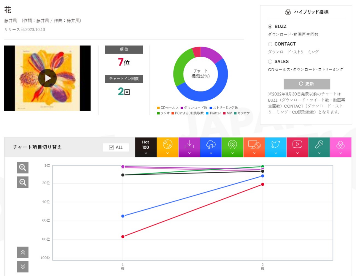 ラジオOA回数ランキングとビルボードジャパンソングチャートのラジオ指標で順位が異なるのは、IMP.「SWITCHing」において『オンエア獲得のほとんどが関東・関西のFM局と局地的』であり、聴取可能人口が多いラジオ局でのOAが指標面で有利に作用したゆえといえます(『』内は上記記事より、以下同様)。他方藤井風「花」は1局を除く30局でOAされており、聴取可能人口に関係なく全国各地で流れたことが記事から解ります。