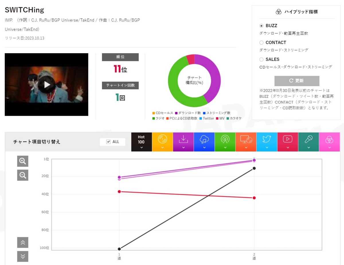 最新10月25日公開分ビルボードジャパンソングチャートのラジオ指標では藤井風「花」(総合ソングチャート7位)を挟み、IMP.「SWITCHing」が1位(総合11位)、MAZZEL「Carnival」(総合4位)が3位にランクイン。この指標は全国31のラジオ局におけるOA回数(プランテック調べ)に各放送局の聴取可能人口等を加味して指標化されるのですが、OA回数ランキングでは「花」「Carnival」「SWITCHing」の順となっています。