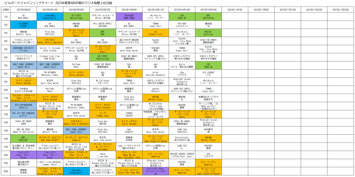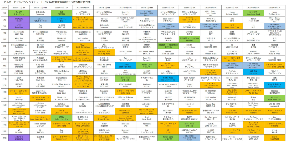 上記は2023年度におけるビルボードジャパンソングチャートのラジオ指標上位20曲の推移を示した表。青が旧ジャニーズ事務所所属歌手、灰色っぽい青はLDH所属の男性歌手、緑が旧ジャニーズ事務所およびLDH所属以外の男性歌手(いずれもグループ)、紫がK-POP男性歌手、そしてオレンジが男女にかかわらずK-POP以外の洋楽を指します。