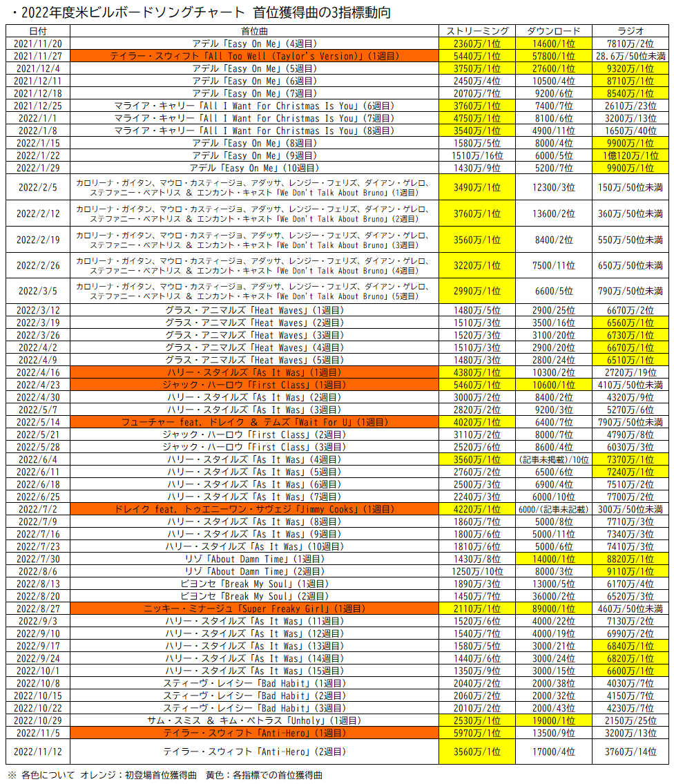 ダウンロードおよびストリーミング(動画再生を含む)は米ビルボードソングチャートを構成する3つの指標のうちふたつを指します。下記は「KICK BACK」がリリースされた2022年度および2023年度の米ビルボードソングチャート首位獲得曲の指標構成を一覧化したものですが、近年はダウンロード数が少なく、またストリーミング再生回数も以前に比べてダウンする傾向にあります。