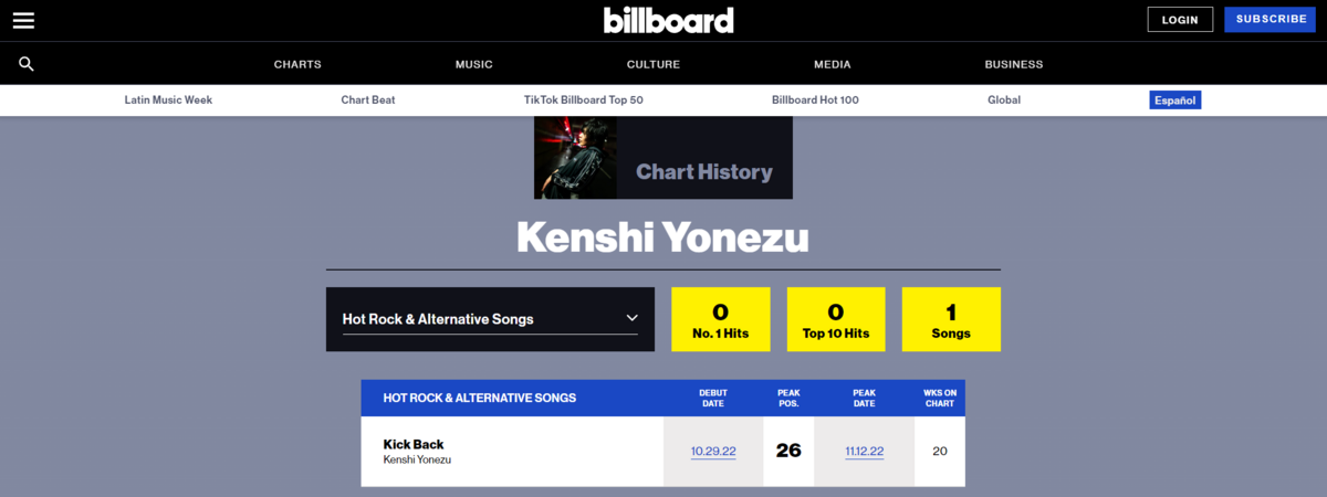 米津玄師さんおよびYOASOBIの米ビルボード各種チャートにおける成績一覧は上記リンクから確認できます。YOASOBI「アイドル」は東南アジアの複数の国や地域で上位に進出している一方、米津玄師「KICK BACK」は東アジアをはじめカナダのソングチャートでも登場していることが解ります。そして「KICK BACK」は米ビルボードのジャンル別チャートにも登場しているのです。