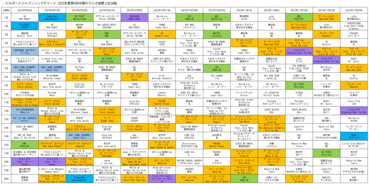 次に掲載した表は2023年度のビルボードジャパンソングチャート、ラジオ指標における週間20位までの推移。オレンジがK-POP以外の洋楽、青が旧ジャニーズ事務所所属歌手、黄緑が旧ジャニーズ事務所所属以外の男性アイドル/ダンスボーカルグループ、薄青がLDH所属の男性ダンスボーカルグループ、紫がK-POP男性歌手を指します。またYOASOBI「アイドル」についてはピンクで表示しています。