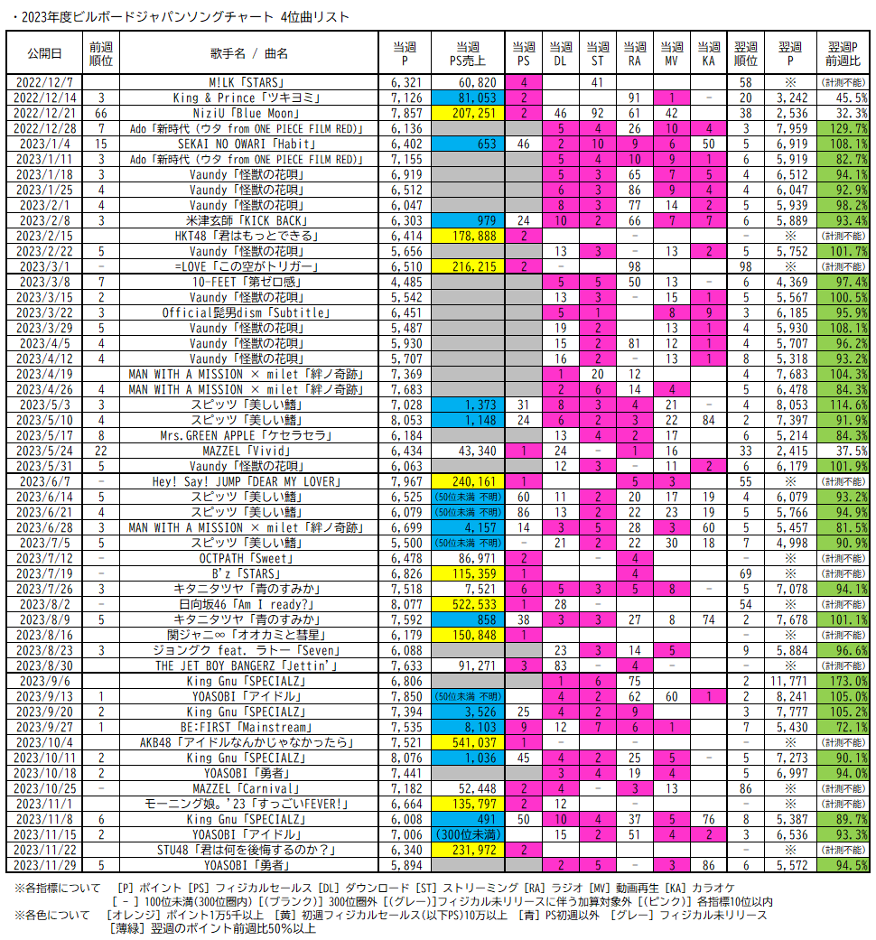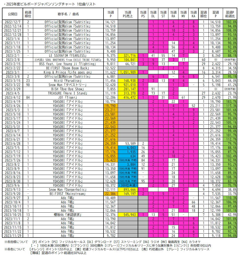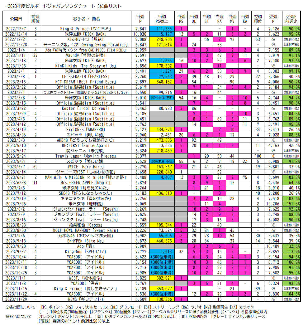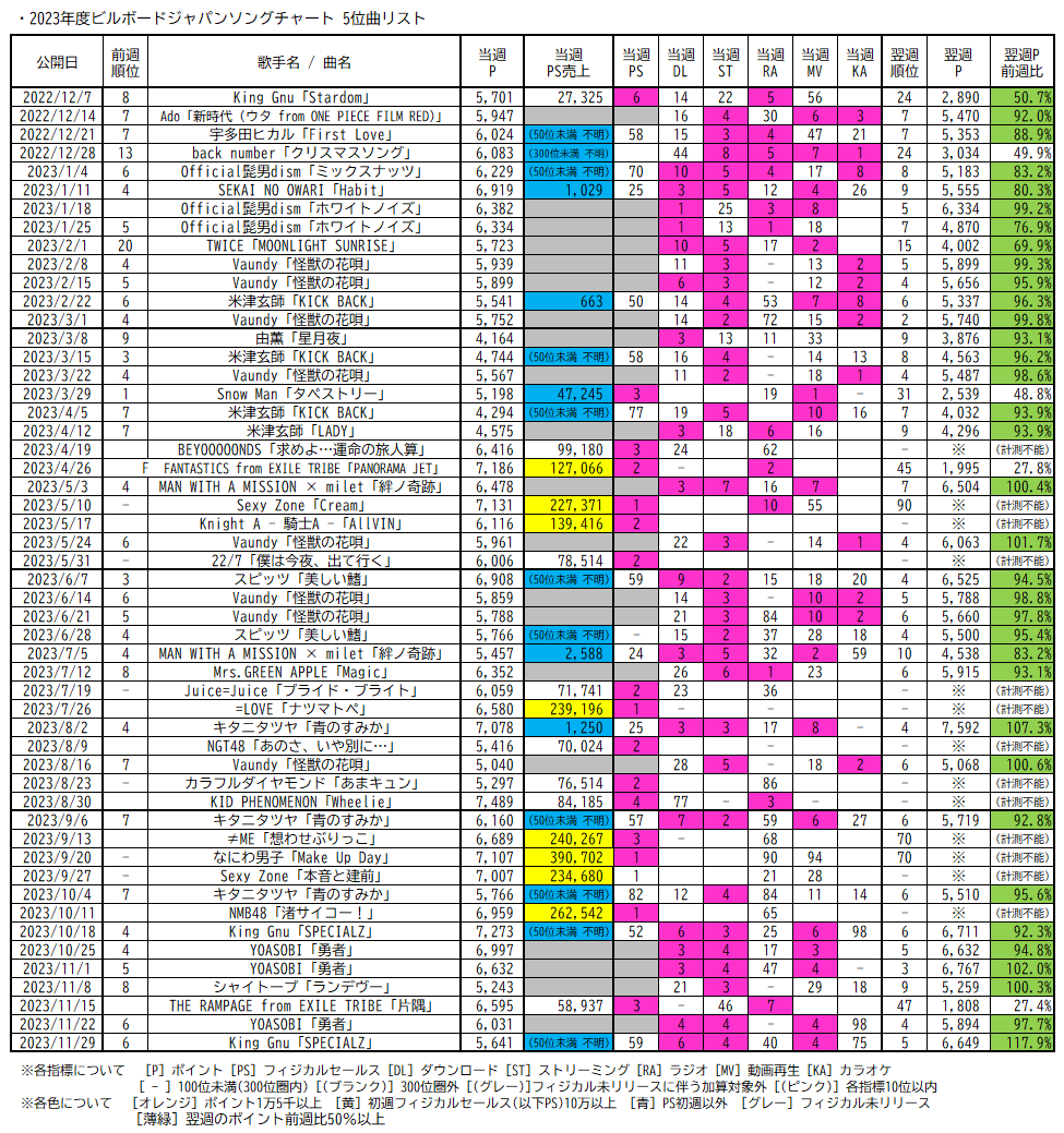 なお2023年度以降はチャートポリシー(集計方法)の大きな変更がないといえるため、純粋に比較可能といえます。また、たとえばフィジカルセールスが初週10万枚を超える作品については総合でトップ5入りする傾向が強い状況です。それらを踏まえ、2023年度以降のビルボードジャパンソングチャートにおける週間1~5位リストを掲載します。