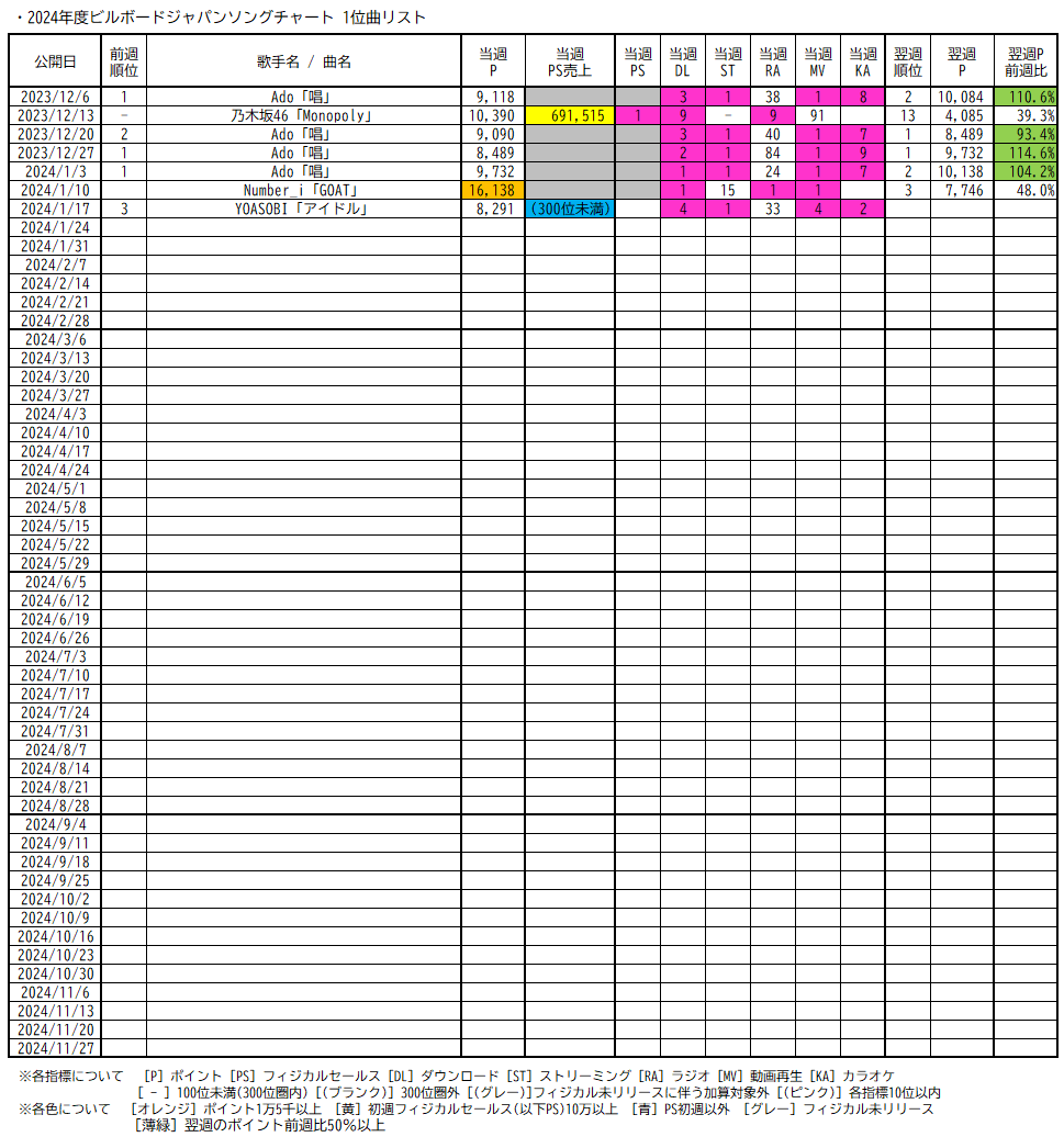 <2024年1月10日公開分 ビルボードジャパンソングチャートにて