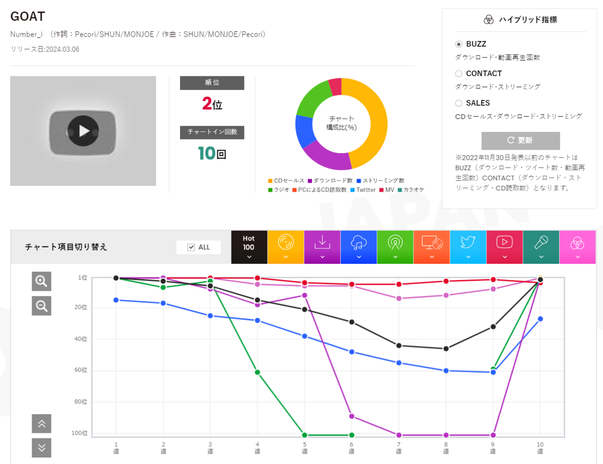 7週間ぶりのトップ10入りとなったNumber_i「GOAT」は、3月6日のフィジカルリリースを受け、32位→2位へ上昇した。初週481,475枚を売り上げてCDセールス1位、ダウンロード24,601DLで1位、ラジオ1位と合計3指標で1位を獲得。そのほか、動画再生は1,439,615再生で4位、ストリーミングは3,389,427再生で27位となり。総合ポイントは14,974ポイントとなった。僅差で1位には届かなかったが、3位以下には約2倍以上という大きな差をつけて総合2位となった。