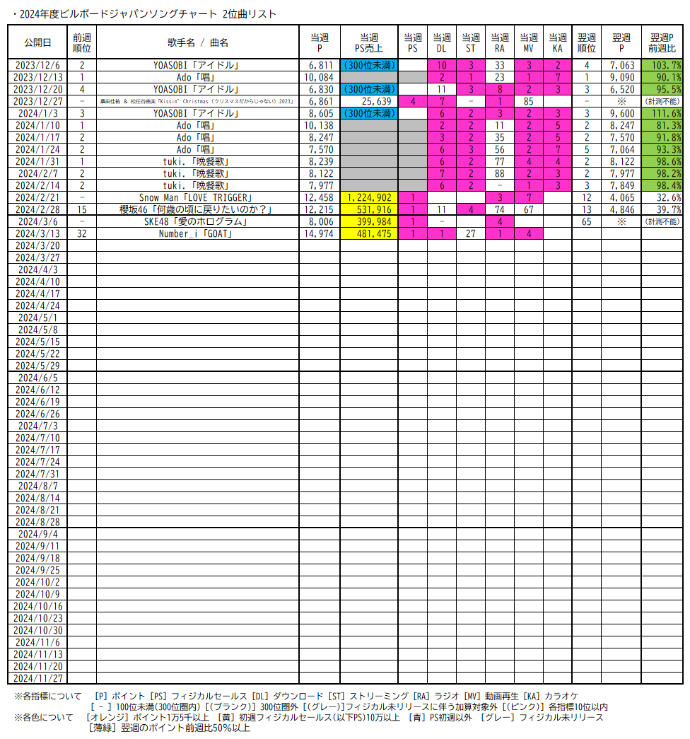 (2023年度以降のビルボードジャパンソングチャートにおける1位および2位のリストから、今回のNumber_i「GOAT」における獲得ポイントの高さが解るでしょう。2023年度のリストを掲載したのは、同年度初週以降においてビルボードジャパンがソングチャートのチャートポリシー(集計方法)を大きく変更していないためです。)