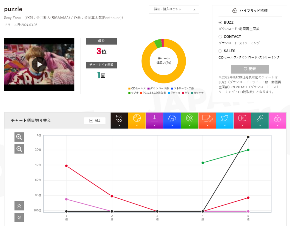 Number_iは今回、フィジカルセールス、そして総合ソングチャートにおいて、Sexy Zone「puzzle」を上回りました。