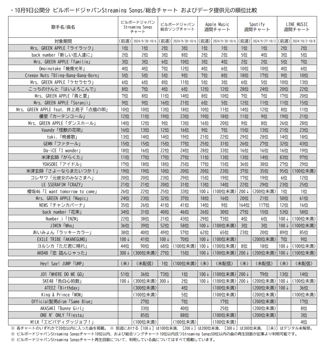 (Creepy Nuts「オトノケ」はビルボードジャパンによる総合およびストリーミング指標、また主要サブスクサービスで20位以内に入っていませんが、Apple Music週間チャートでは36位、LINE MUSICでは32位に初登場を果たしています。なおSpotify週間チャートの集計期間は「オトノケ」リリース前日となる10月3日までとなります。)
