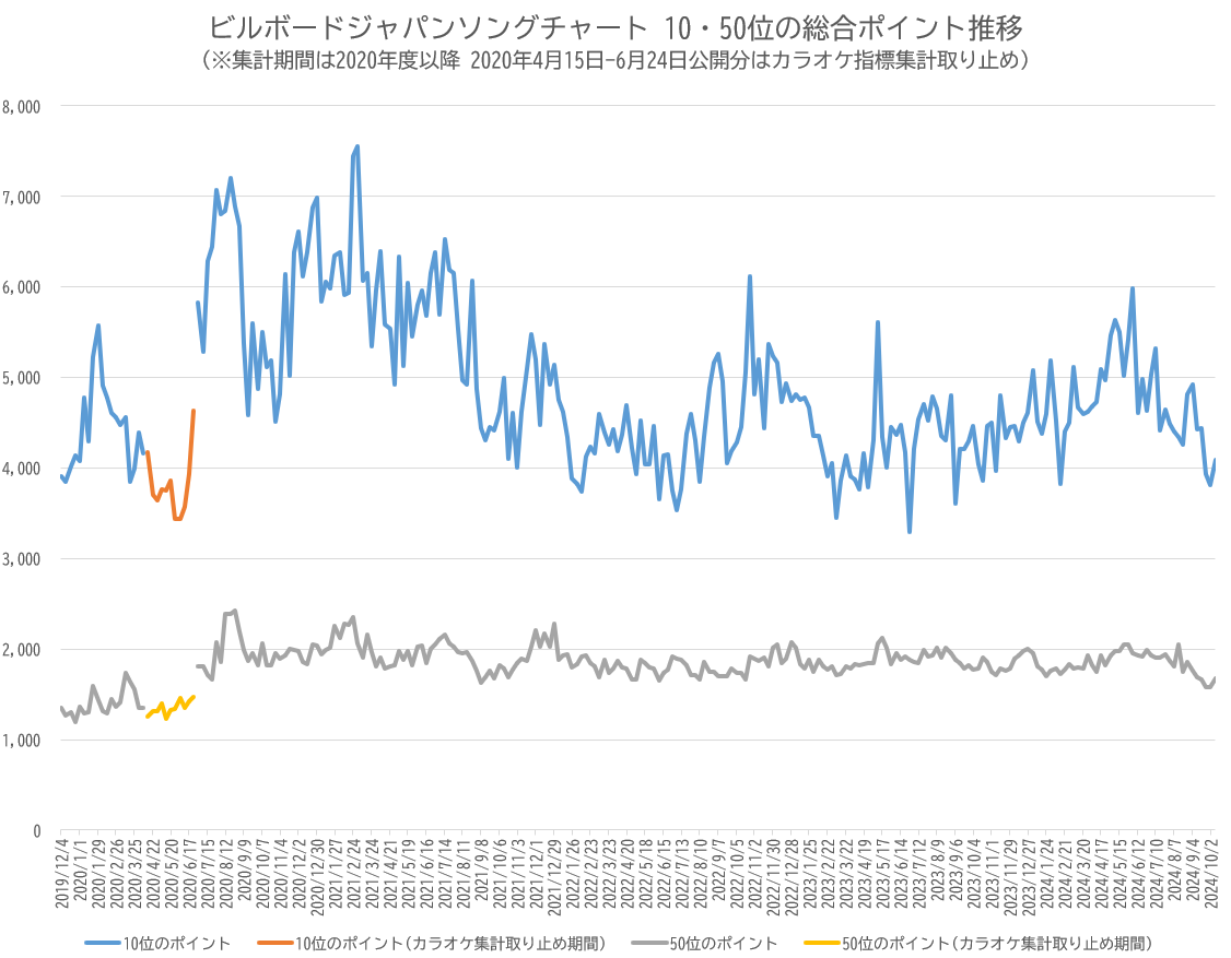 ここ最近、ビルボードジャパンソングチャートにおけるポイントが全体的に下がっています。2024年度において1位のポイントは9月11日公開分(6,778ポイント)、10位は10月2日公開分(3,810ポイント)、そして50位は9月25日公開分(1,575ポイント)と、この1ヶ月の間にいずれも最低を記録しています。