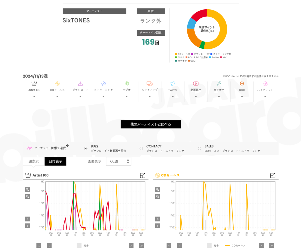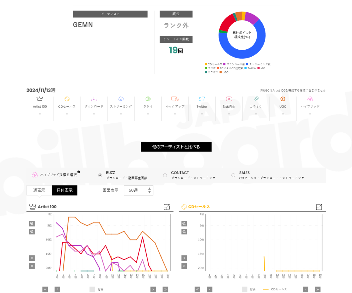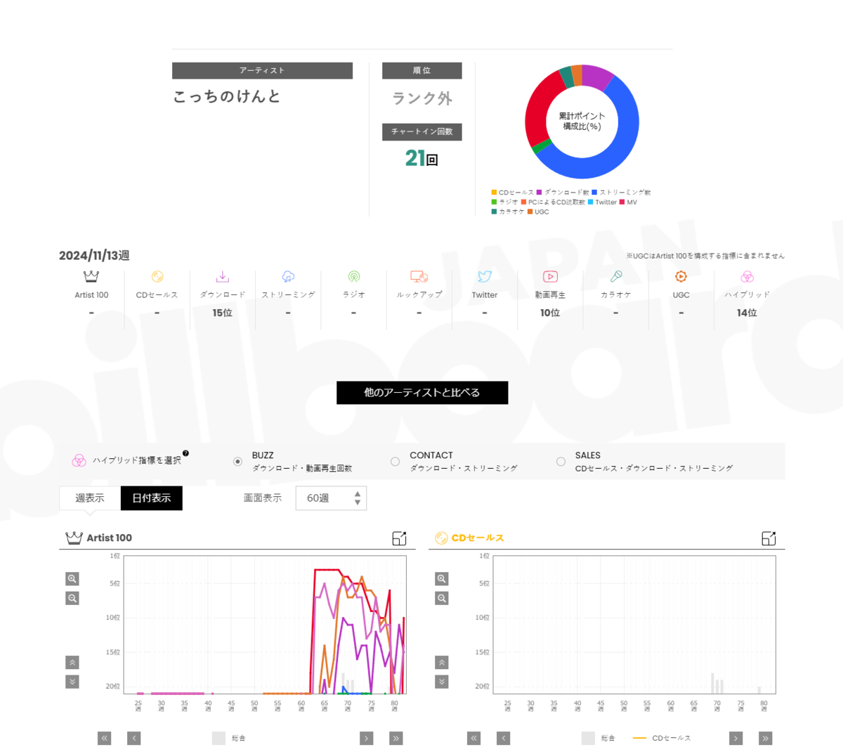 日本のアイドルやダンスボーカルグループは基本的に、男女問わずフィジカルセールス主体となる一方、接触指標群(ストリーミングや動画再生)が強くない傾向にあります。ヒット曲を輩出し接触指標群が強くなることで年間単位でのヒットにつながり、トップアーティストチャートも安定するため、まずは主にフィジカルセールス指標が初加算された曲における翌週以降の動向(総合順位や接触指標群の推移)をみることが重要です。
