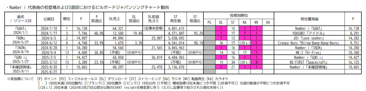 土曜付エントリーで掲載するストリーミング表を上記に。Number_i「未確認領域」はSpotifyで比較的強いながらも、実はそのSpotifyにおいてこれまでと動きが異なっているものと捉えています(この点は後日紹介予定です)。Number_i「未確認領域」について、次週総合トップ10内をキープできるか注視する必要があります。