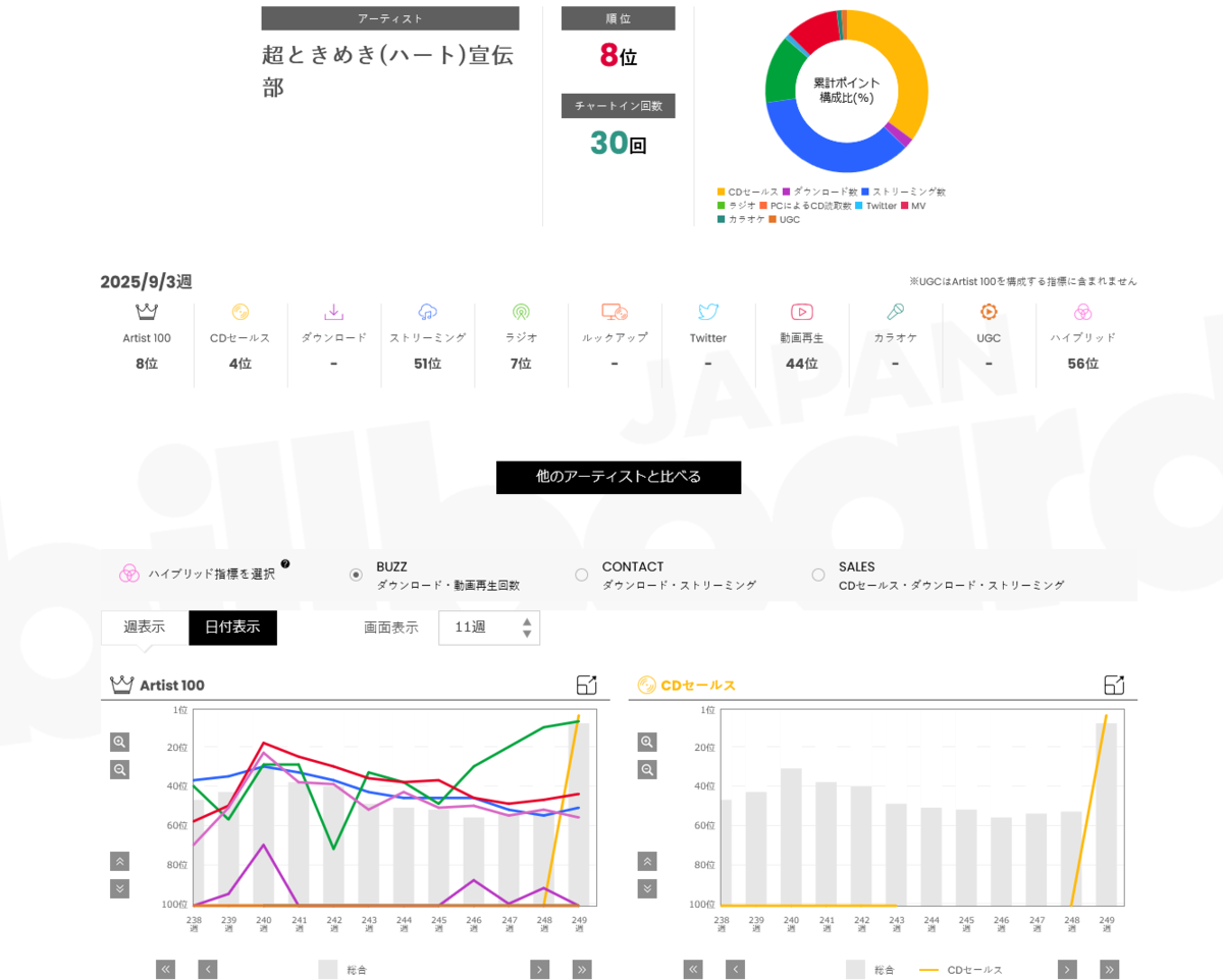 またソングチャートではSTU48「傷つくことが青春だ」、超ときめき♡宣伝部「ハートな胸の内♡」そしてOCHA NORMA「女の愛想は武器じゃない」がそれぞれ4、5、6位に初登場を果たしているのですが、トップアーティストチャートではSTU48が13位、OCHA NORMAが14位となり、共に前週未カウントの状態から上昇したのに対し、超ときめき♡宣伝部は53→8位に浮上しトップ10入り、且つ自己最高位を更新しています。