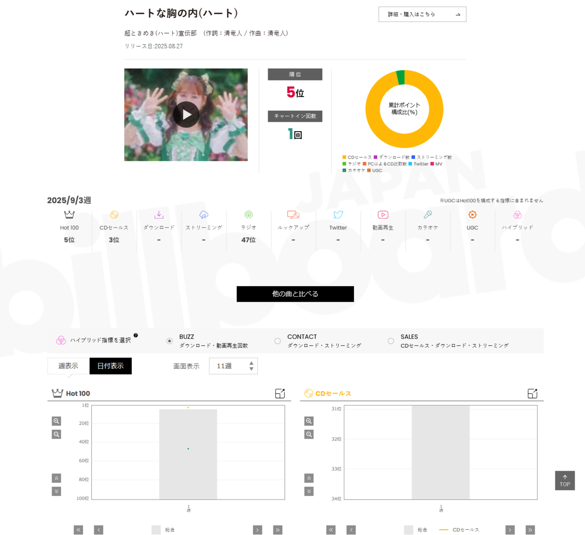 ビルボードジャパンソングチャートのフィジカルセールス指標は、フィジカルシングルがダブルやトリプルAサイドの場合は1曲のみに加点されます。超ときめき♡宣伝部による2曲は当週のラジオ指標でも「超最強」が強いながら、しかしフィジカルセールス指標は「ハートな胸の内♡」に加点されています。仮に「超最強」がフィジカルセールス指標加算対象曲だったならば、同曲は最新ソングチャートで3位に入ったでしょう。