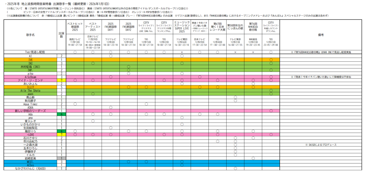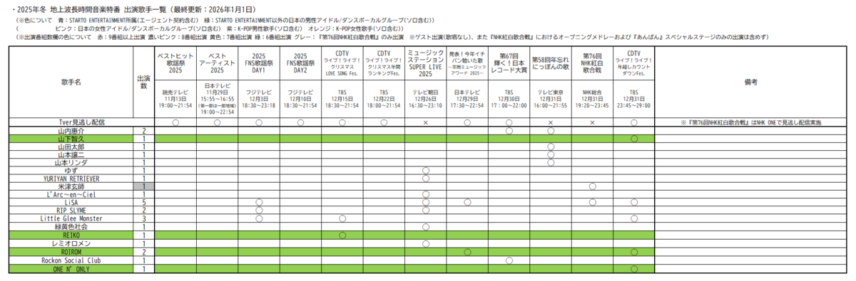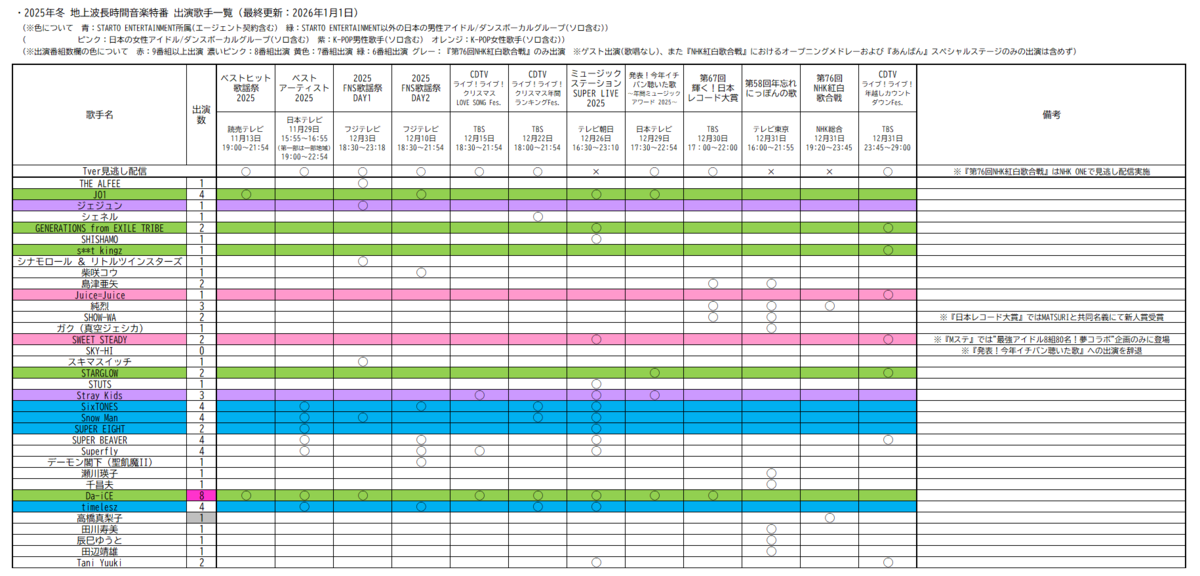それでは、出演歌手一覧表を以下に掲載します。なお、番組にソロで出演しながらグループでの出演がない場合は"ソロ名義 (グループ)"と記載。また『FNS歌謡祭』でのミュージカル企画については歌手を一括りにして掲載しますが、それ以外は基本的に分けてクレジットしています。また『NHK紅白歌合戦』においてオープニングメドレーや『あんぱん』スペシャルステージのみに参加した歌手についてはカウントに含めていません。